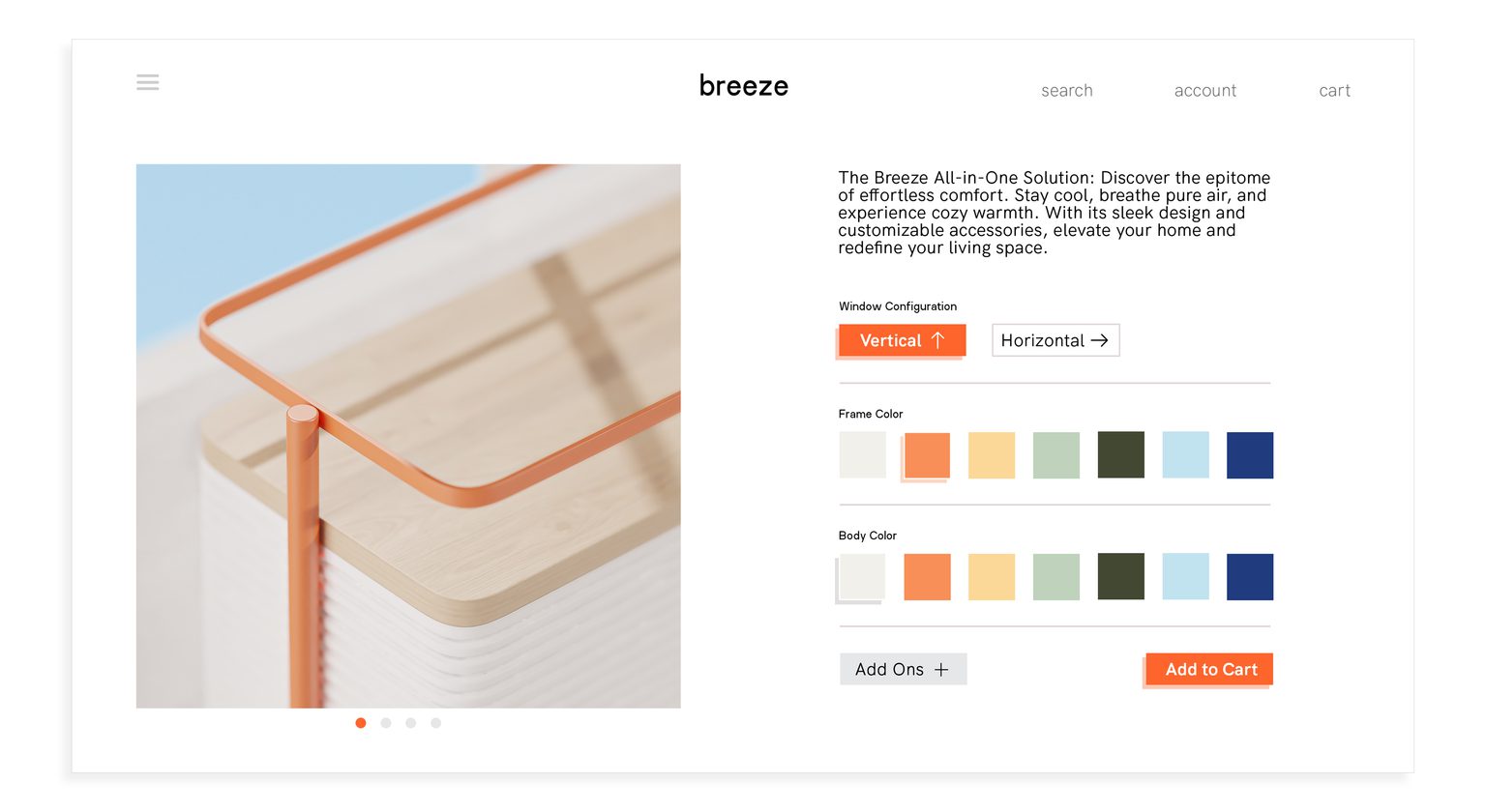Because we knew this appliance would be out all year, we wanted to ensure it provided more value than its core functionalities. We all share the need to have a place to either store or display our personal objects. In Breeze’s frame, the product strategy consulting team created a suite of accessories to cater to a variety of needs. With a range of several colorways, modular accessories, and a multi-layer filtration system, Breeze uplifts indoor style while offering relief from allergies, dust, smoke, and heat.