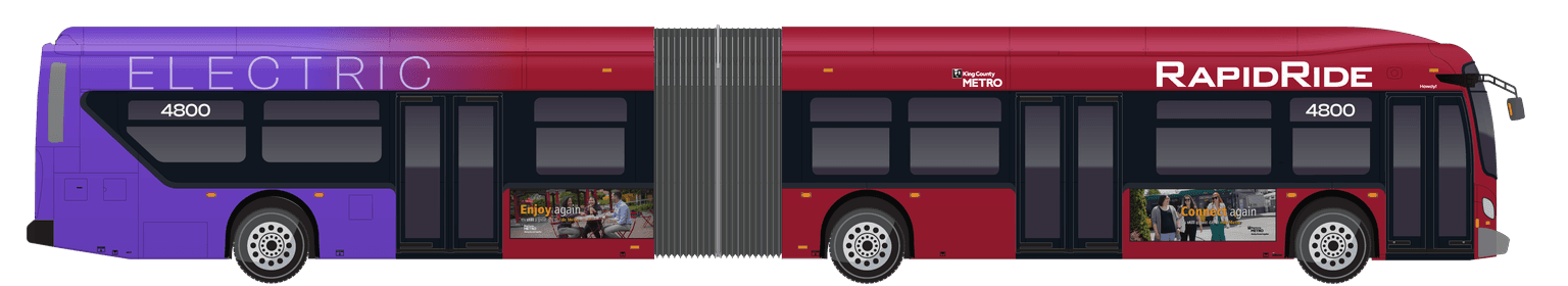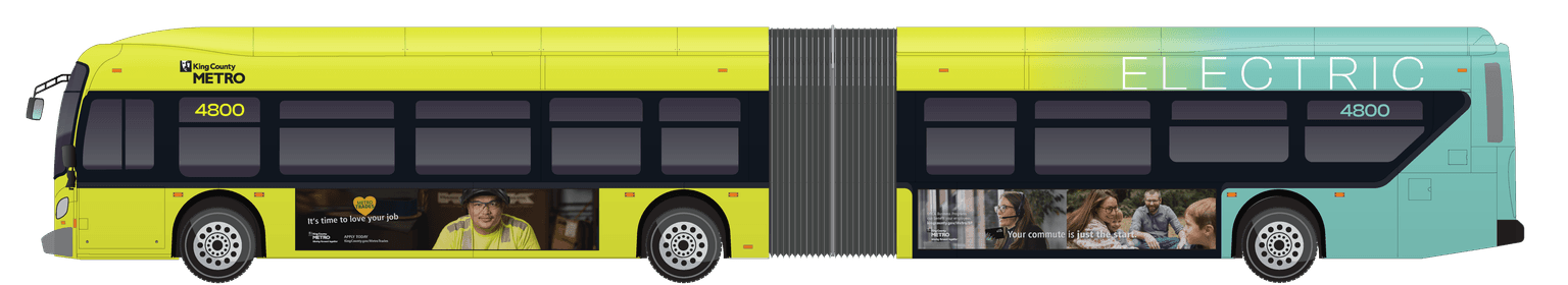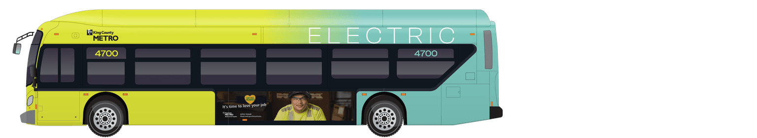 The King County Metro team had an internal goal to stand out from other transit groups in the area, but also reflect the culture and values of King County. We wanted to avoid overused “green” design motifs, such as leaves, electric plugs, and swooshes which add unnecessary complexity and no longer resonate with consumers due to their association with greenwashing. Instead, the new design communicates new energy with striking use of color and eschews complex art in favor of a clean, simple approach that reduces the number of colors, and therefore, paint waste. Brighter colors will also reflect heat, which helps extend battery life and potentially improves range-per-charge.